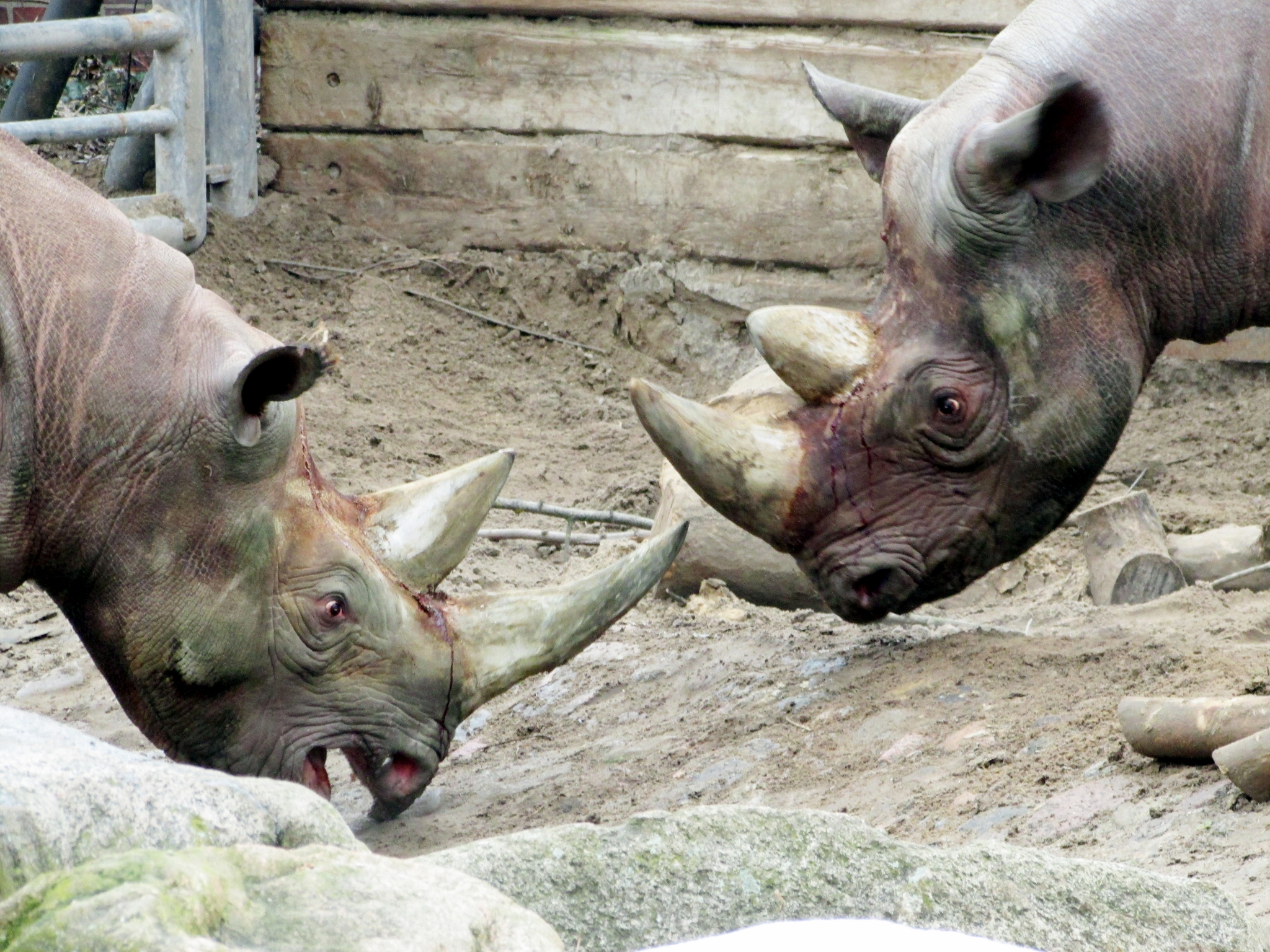 Auf unserem Besuch im Zoo Berlin trafen wir auf zwei verstrittene Nashörner die sich beide nicht aus dem Weg gehen wollten. Nach einer Info an die Pfleger konnten die Beiden aber getrennt werden bevor Schlimmeres passiert.
